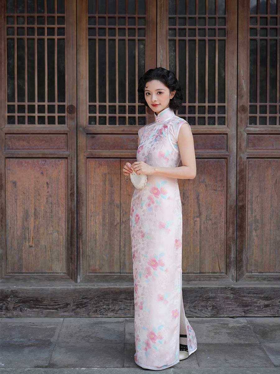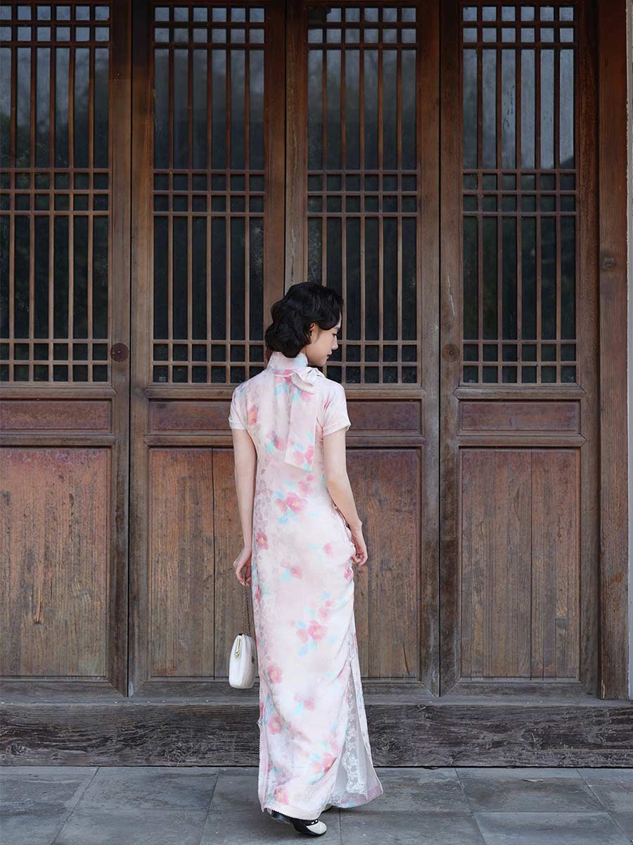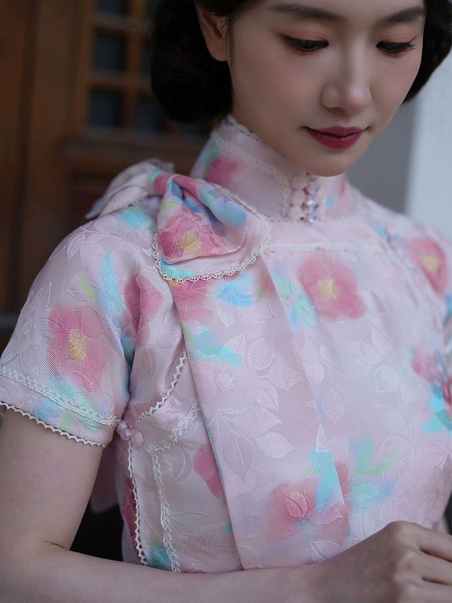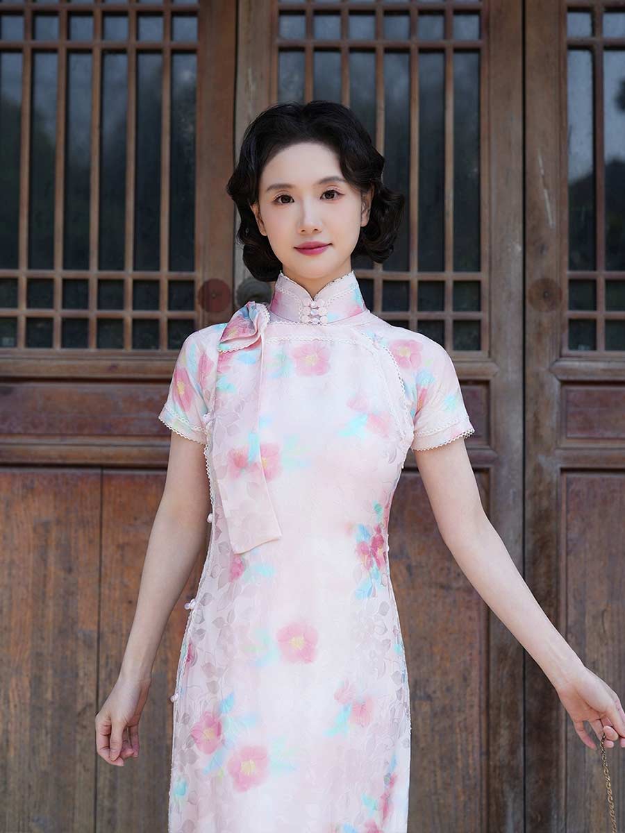 The 春和景明 (Spring Harmony) Qipao is a refined piece of traditional flat-cut (平裁) tailoring, featuring a sophisticated 30.5 momme heavyweight silk blend camellia jacquard. This garment is designed with a high collar that elegantly hugs the neck and a silhouette that best flatters "pear-shaped" bodies with a flatter upper torso. The short-sleeved version includes delicate lace lining and a detachable butterfly bow, while the sleeveless version offers a clean, single-layer look with traditional "flower and leaf" hard-buckle closures. Every piece is crafted from natural materials pre-shrunk before tailoring to ensure quality and a timeless vintage aesthetic.