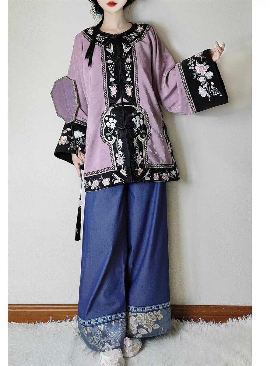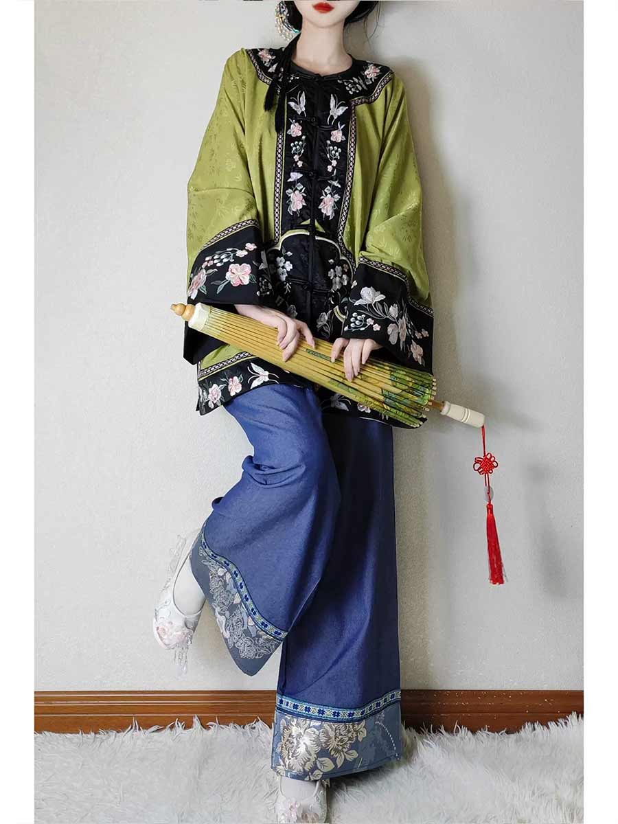 Reimagining the elegance of the late Qing Dynasty, the 柒小乔 (Qi Xiao Qiao) collection presents this improved Magua (马褂) and trouser set. Historically inspired by "Han Female" attire of the Qing period, the top features a central-opening (对襟) silhouette decorated with meticulous heavy industry floral embroidery. This ensemble is designed to offer a balanced blend of historical accuracy and modern wearability, making it ideal for professional photography, cultural exhibitions, or refined "New Chinese Style" wardrobes. Available in a palette of five classic colors, each set is crafted to showcase the intricate textures and majestic layering characteristic of period-accurate Chinese dress.