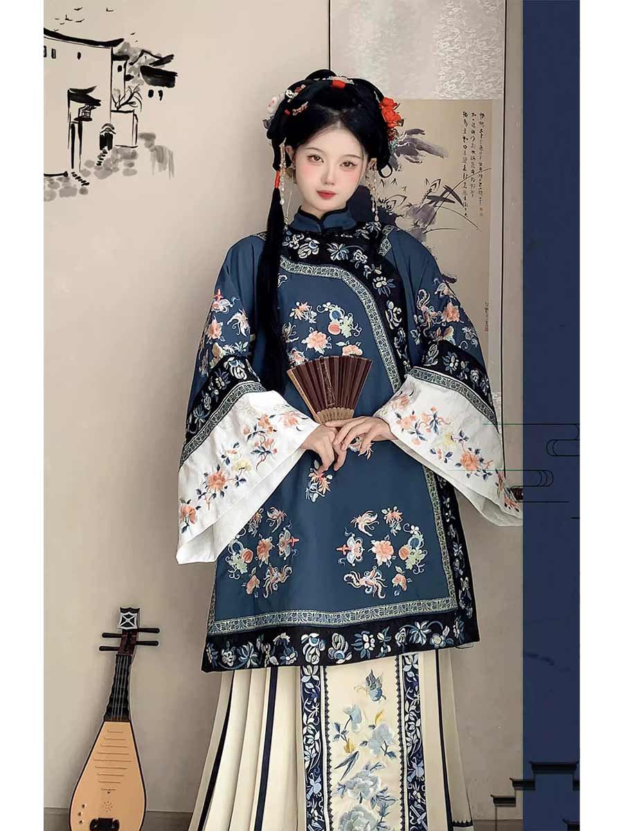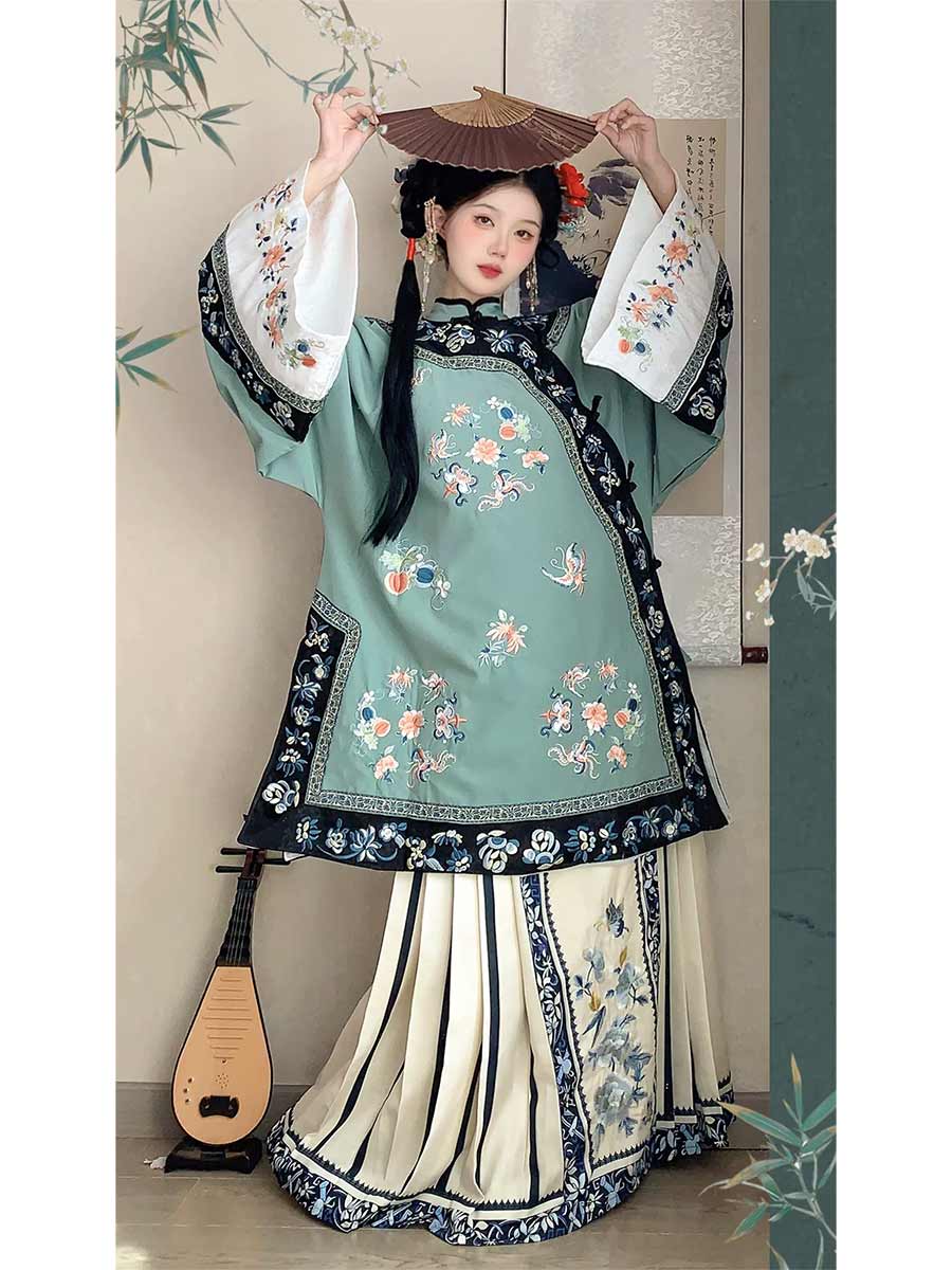 柒小乔 Original Qing Dynasty Style Embroidered Set: Slanting Collar Top & Mamian Skirt - Authentic Photography Attire