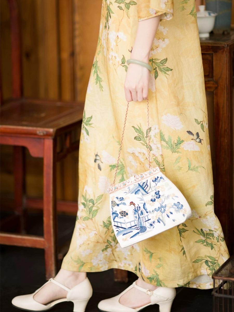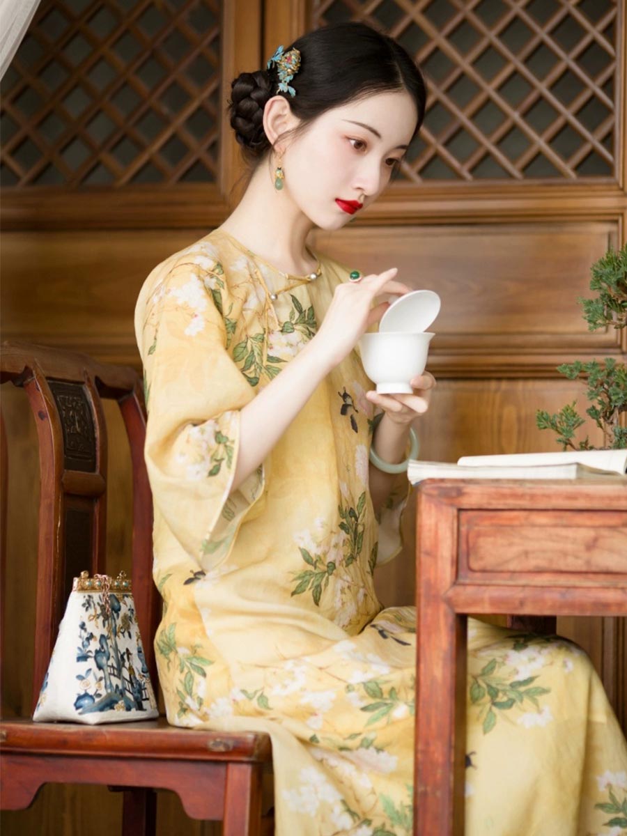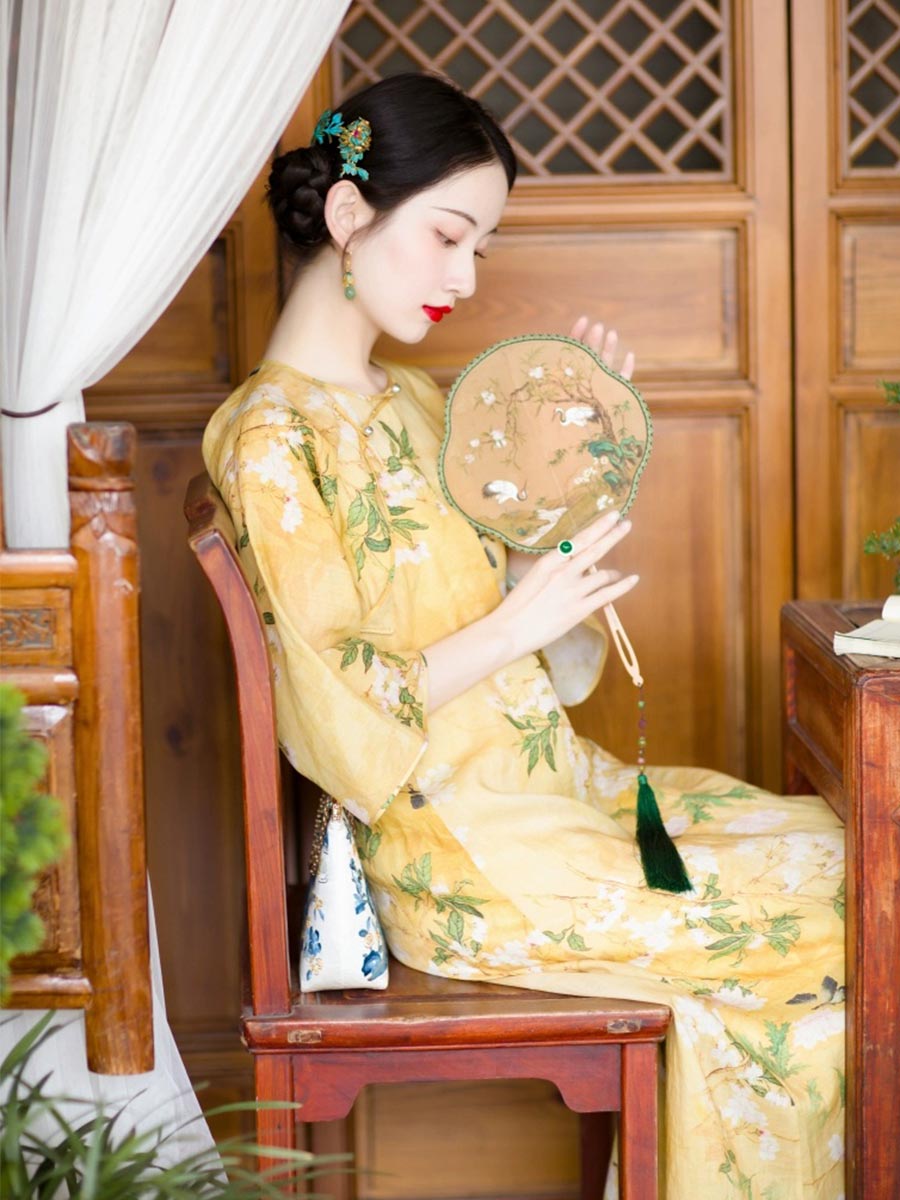 Inspired by the early 20th-century "New Woman," the 一城风絮 (Yī Chéng Fēng Xù) Qipao features a revolutionary collarless design that elegantly highlights the neck and collarbone. This original Republic of China style dress utilizes a traditional "Gamma-shaped" front opening (厂字襟) and manual "Pankou" frog buttons, achieving a perfect balance between vintage authenticity and modern practicality. The "Dao Daxiu" (inverted large sleeves) and loose A-line silhouette create a vibrant yet serene aesthetic, printed with poetic crabapple and peony motifs that symbolize beauty and longing. Crafted from a soft Tencel-linen blend, this garment offers the moisture-wicking properties of linen with a much gentler, smoother hand-feel.