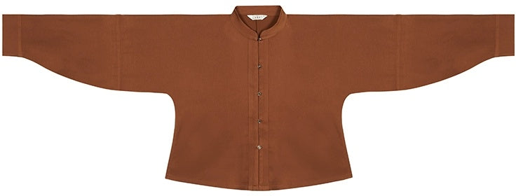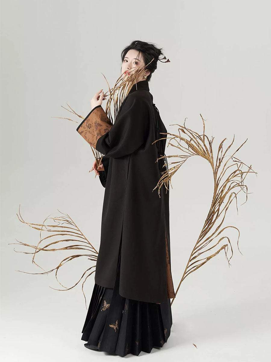 Paired with the simple yet elegant brown Stand-Collar Shirt (立领衬衫), this ensemble offers a sophisticated and meaningful look suitable for both daily wear and special occasions.