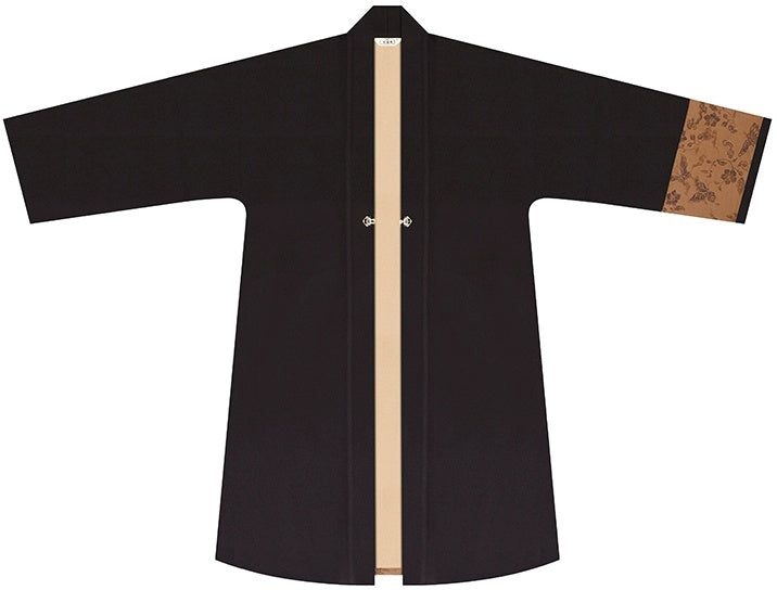 The Modified National Style Outer Jacket (改良国风外套) is a re-envisioned Song Dynasty Beizi with a stand-collar silhouette. It features practical side pockets and a uniquely artistic back panel with ink-wash elements of Chinese characters and landscapes, as if concealing a secret hundred-flower garden. A decorative Chinese frog button is included, which can be attached or detached according to personal preference.