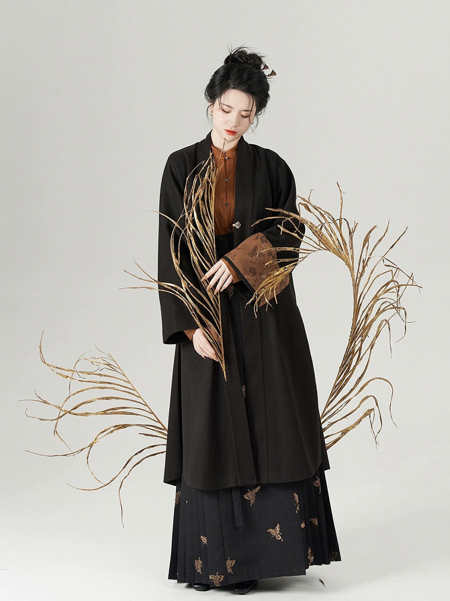 The Mamian Skirt (马面裙) is the collection's centerpiece, featuring the Hundred Butterflies pattern woven in shimmering gold thread. The soft rayon base provides exceptional comfort, while the dark background beautifully accentuates the texture and fluttering motion of the butterflies.