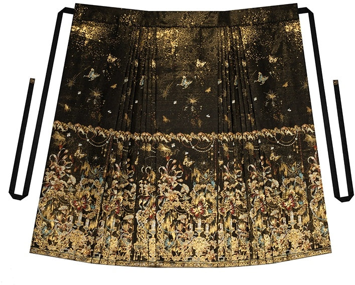 The Mamian Skirt (马面裙) is a masterpiece woven from luxurious Zhuanghua Satin. Its design features a scene of hundreds of lilies blooming around candelabras, with butterflies fluttering amongst them. Cascading pearl chains seem to drape down the fabric, creating the magnificent posture of a "daughter from a wealthy family."