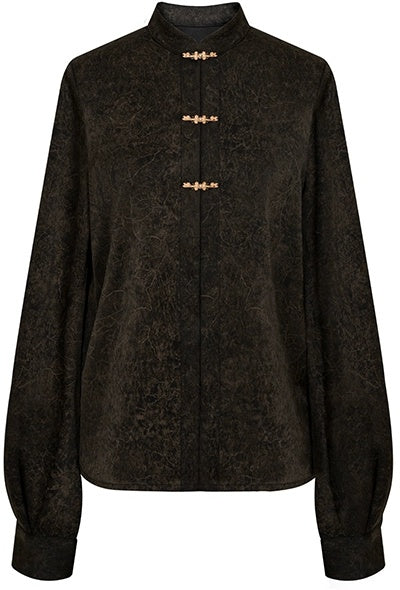 The Stand-Collar Shirt (立领衬衫 - lì lǐng chèn shān) is subtly infused with sprinkled gold threads that shimmer beautifully from different angles. Exquisite metal double-loop clasps adorn the central placket, adding a touch of refined elegance.