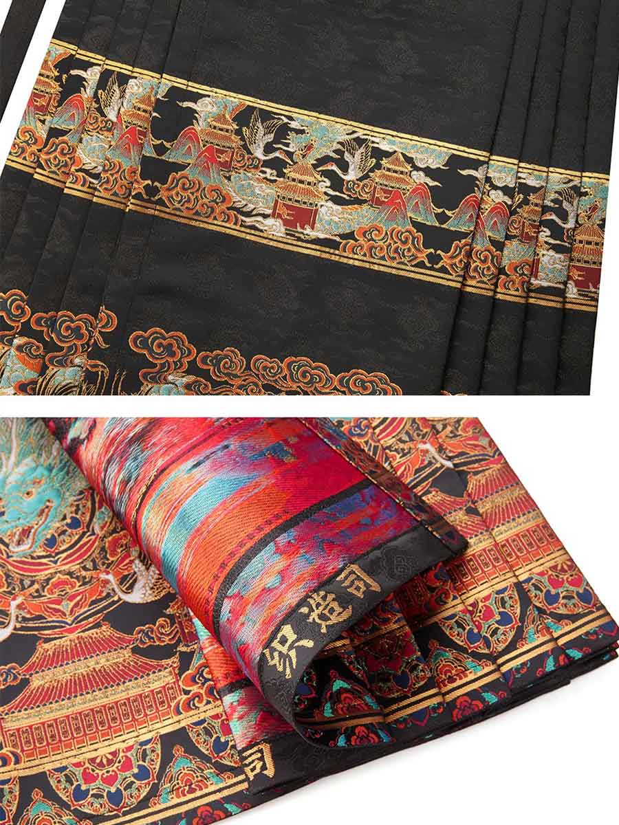 The design highlights are masterful. The black version of the skirt is woven with gold thread, creating a shimmering effect under different lighting that brings out a subtle green luster. In contrast, the red version uses a vibrant yellow-gold thread to create a more pronounced and radiant golden sheen. The skirt panel pattern is centered around the "Azure Dragon (青龙)," one of the Four Divine Beasts of the orient. This majestic creature, exuding power and authority, is accompanied by celestial cranes, auspicious clouds, treasure flowers, and silhouettes of palace architecture, together creating a magnificent scene of auspiciousness and grandeur.