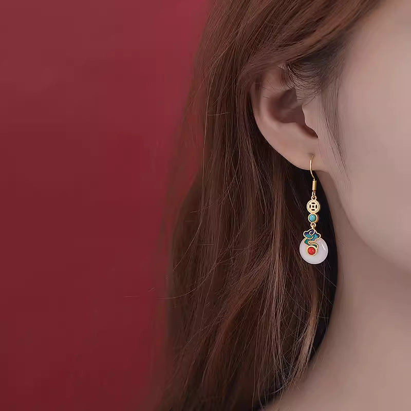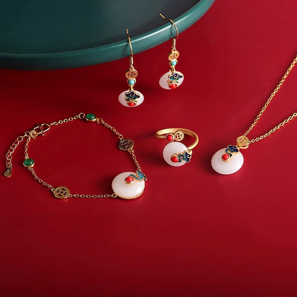 Invite good fortune and prosperity with the 祥云 (Xiángyún - Auspicious Cloud) jewelry collection. This series features a unique, niche design that blends traditional Chinese metaphysical symbols with modern elegance. The ring is centered around a hand-selected He Tian Jade disc, symbolizing peace and longevity, paired with an intricate Auspicious Cloud motif crafted in cold enamel cloisonné style. Made with high-quality S925 Sterling Silver, this open-ended ring is designed for versatility, fitting comfortably as a pointer finger ring or a pinky ring. Whether as a gift of protection or a personal statement of style, this set brings a soulful and romantic aesthetic to the 2025 "New Chinese" wardrobe.