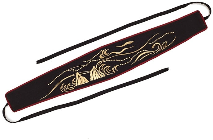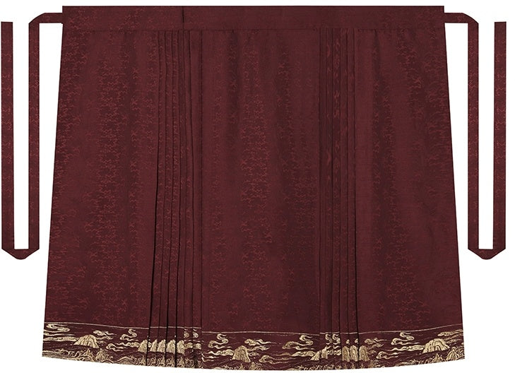 The Waist Seal (腰封 - yāo fēng) is embroidered with a powerful Kui dragon and lotus motif. The Mamian Skirt (马面裙) is crafted from an original Imitation Gold-Woven fabric, its pleats hiding a majestic phoenix among the clouds and mist. The skirt's dark pattern is a combination of auspicious clouds and a phoenix, creating a design that is low-key but far from monotonous.