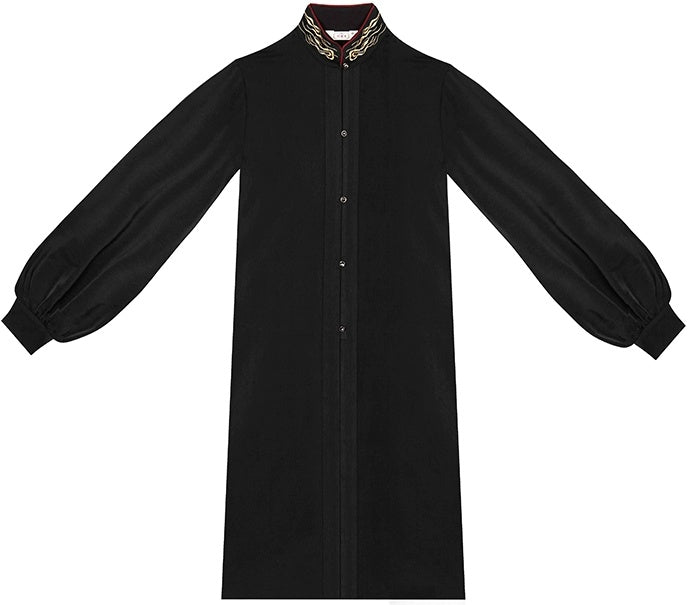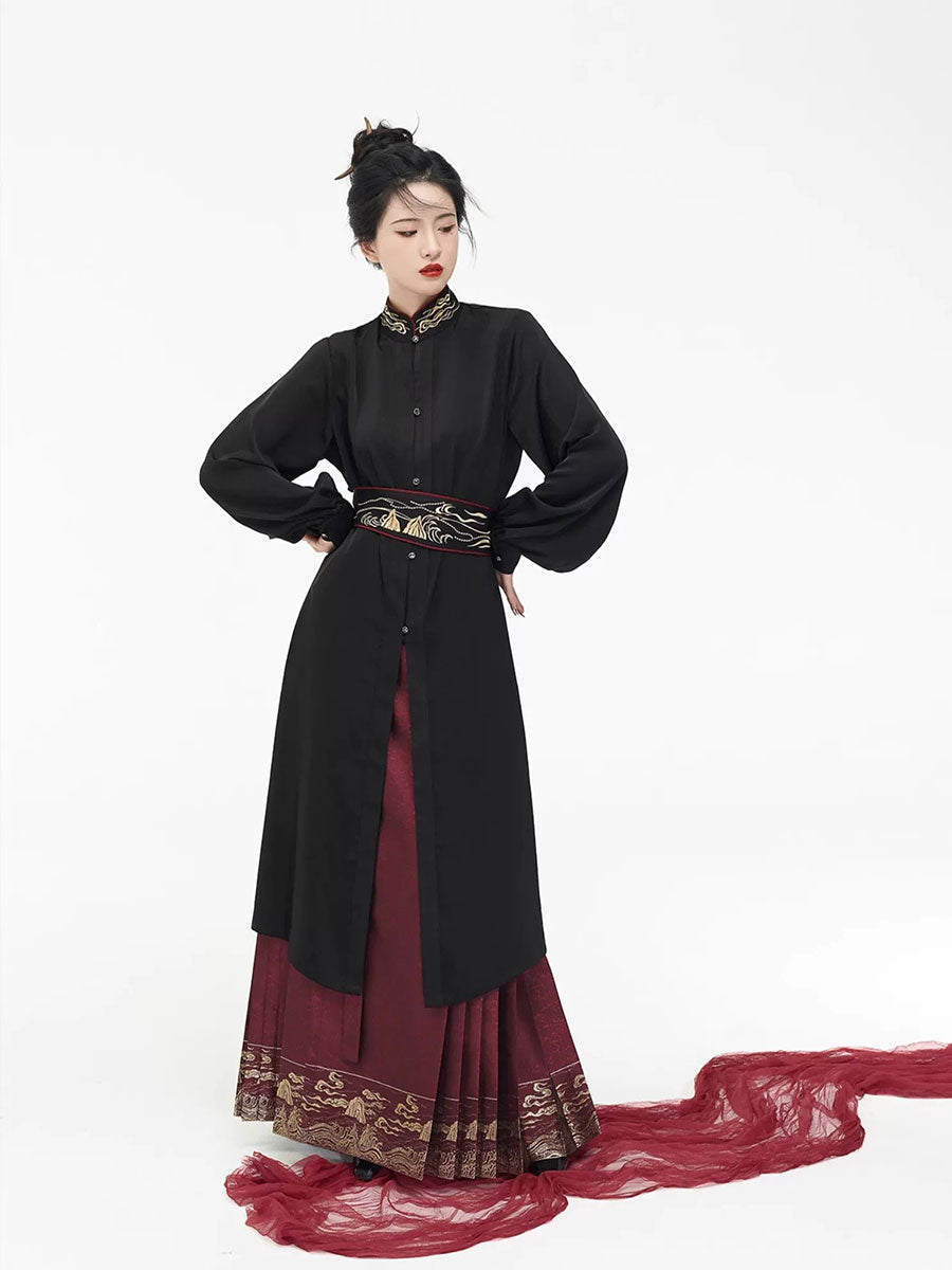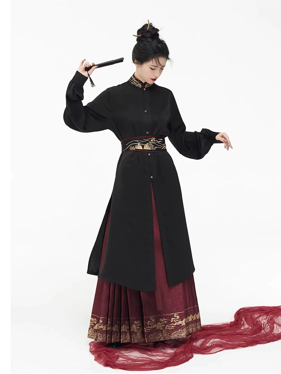 The Han-Element Stand-Collar Long Shirt (汉元素立领长衫) is a modified front-opening shirt with slightly puffed sleeves. Its collar features a red and black color-block design, exquisitely embroidered with auspicious cloud and wave patterns.