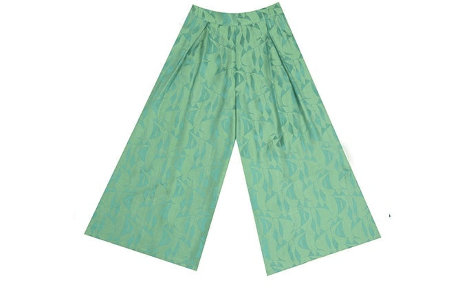 It is beautifully paired with the Green Jacquard Satin Wide-Leg Pants (绿提花缎阔腿裤 - lǜ tí huā duàn kuò tuǐ kù), which are made from a structured faux cotton-linen fabric. The wide-leg cut and relaxed fit make them incredibly versatile and flattering for all body types.