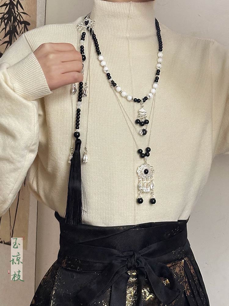 The 'Cloud Serenity' series offers a unique, dark-themed Yīngluò necklace in a New Chinese style, featuring a long tassel and a Back Cloud (背云) piece. This is a bold accessory designed to perfectly complement dark-colored Hanfu and Mamian Skirts.
