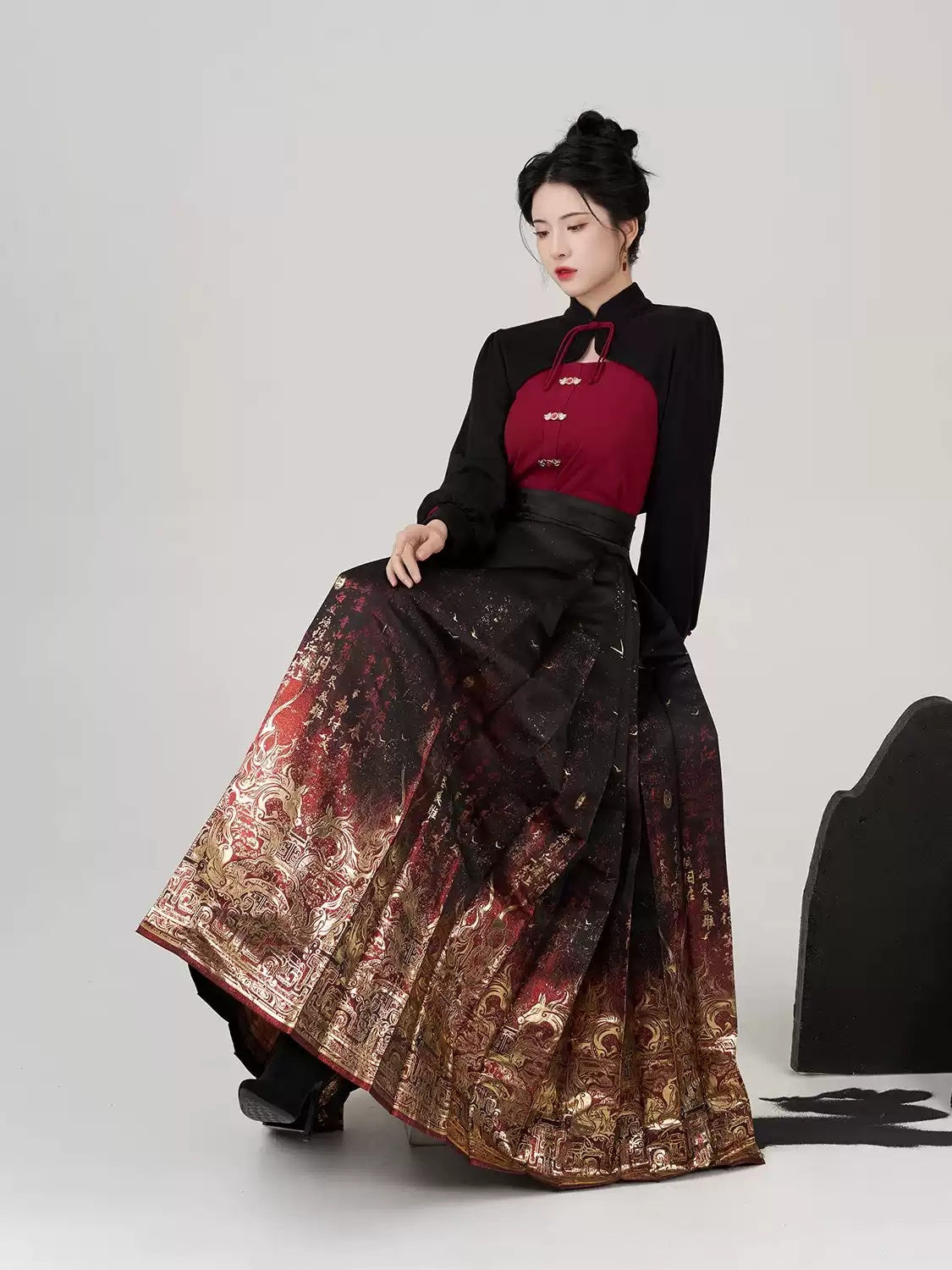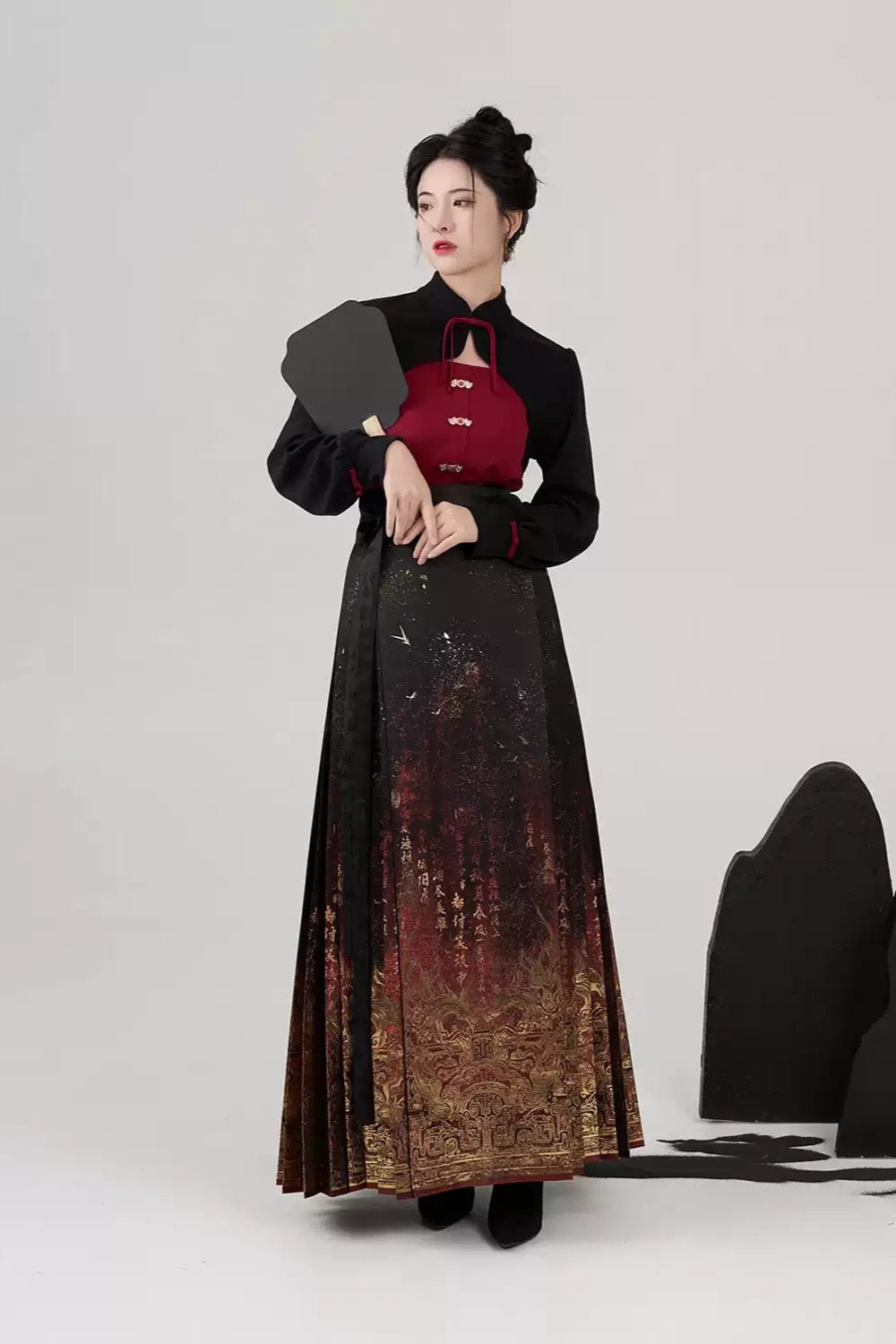 The centerpiece, the Mamian Skirt (马面裙), is a masterpiece of textile art. Its design is rooted in the traditional "Flying Horse" motif, featuring four majestic steeds set against a bronze-hued background that subtly incorporates Pipa and dragon patterns. The intricate weave of gold and red threads bestows the garment with a commanding presence. Woven into its very fabric is the spirit of the Ming Dynasty poem: "How many tales from past and present are all dismissed with a laugh," reflecting a temperament of effortless grandeur.