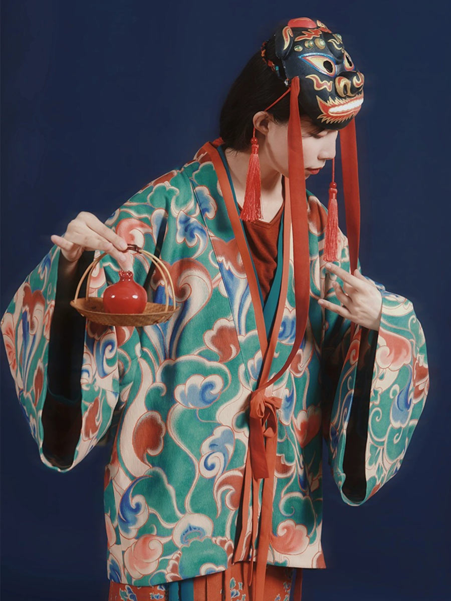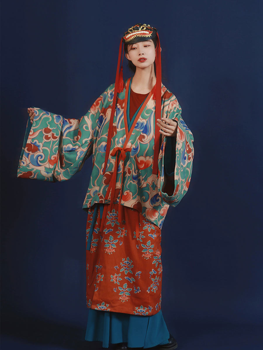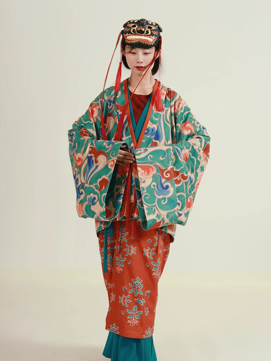 The featured outer layers include the Four Seasons Auspiciousness Pleated Robe (四时吉祥褶衣 - sì shí jí xiáng zhě yī) and its lighter counterpart, the Four Seasons Auspiciousness Unlined Robe (四时吉祥襌衣 - sì shí jí xiáng chán yī). Both robes are inspired by Northern Dynasties silk damask robes (北朝纹缘锦衣).