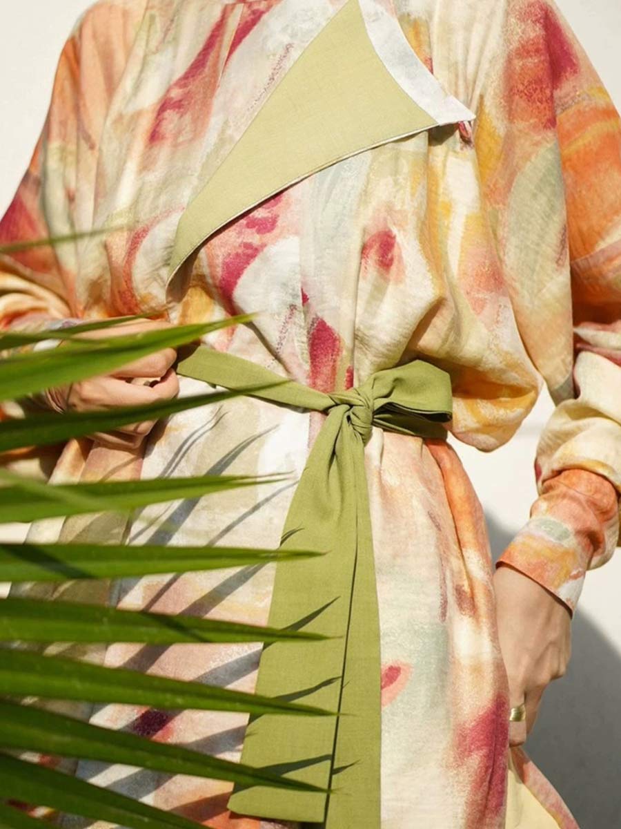 The robe comes with a complimentary Short Belt (短腰带 - duǎn yāo dài) which can be styled as a waist belt, hair ribbon, or neck scarf, offering different looks. Buttons on the cuffs allow the sleeves to be gathered for different occasions. The placket, cuffs, and hem are lined with interfacing for a more structured look.