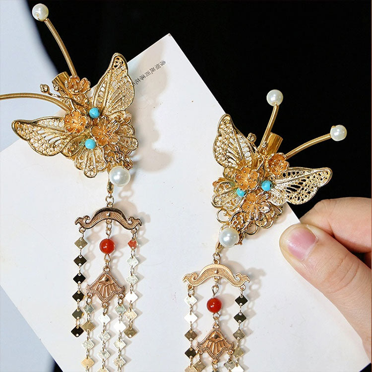 The signature accessory is the Phoenix Suitor Hair Crown (凤求凰发冠 - fèng qiú huáng fà guān), often acquired as a Phoenix Suitor Full Set (凤求凰全套 - fèng qiú huáng quán tào) which includes a pair of hairpins and a back ornament. Also featured is the delicate Butterfly Whisper Hair Crown (蝶语发冠 - dié yǔ fà guān). These elaborate hair accessories are perfect for formal Hanfu events, wedding ceremonies, or intricate traditional styling, embodying classical Chinese luxury.