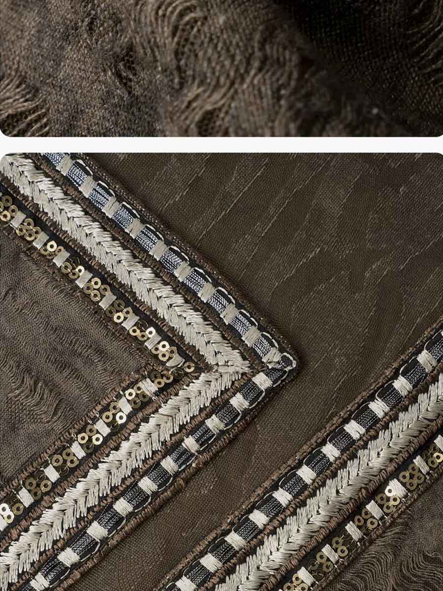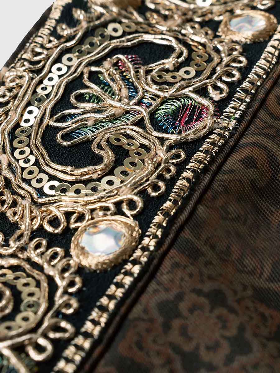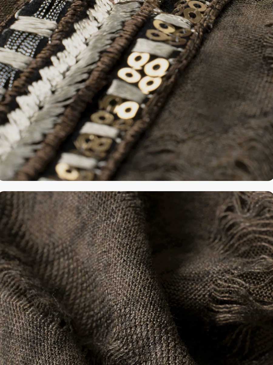The Vest (马甲 - mǎ jiǎ) is a unique "wasteland-style" knit piece that weaves an exotic tapestry. Its collar and the waistband of the pants are adorned with sequin embroidery and coiled gold sequins, shining like a single star in the vast desert.