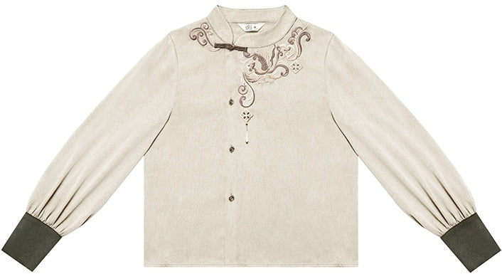 The inner National Style Top (国风上衣 - guó fēng shàng yī) is an olive-green shirt crafted from a pleated, textured fabric. A circular phoenix pattern is embroidered on the collar, its heart of freedom ready to take flight.