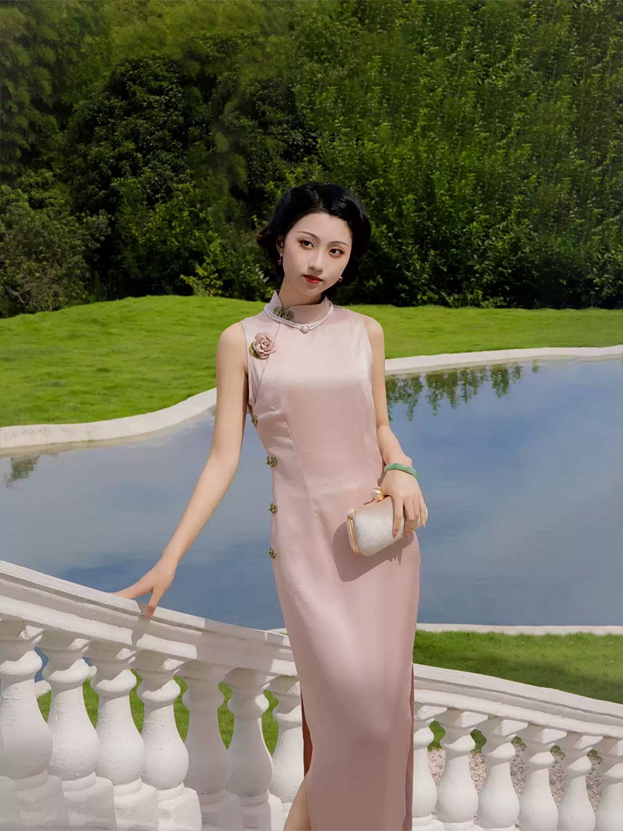 Inspired by the iconic Scarlett O'Hara, the 斯嘉丽 (Scarlett) Qipao is a fusion of classic Hollywood drama and traditional Chinese elegance. This original design features a modern sleeveless, cold-shoulder silhouette that highlights the collarbone and shoulders, creating a slender and sophisticated look. Crafted from luxurious "Pearl Satin," the fabric offers a silky-smooth texture with a delicate luster that resists wrinkling while remaining breathable for summer wear. The unique teardrop-shaped slanting collar and floral accents add a touch of evening-gown glamour, making it perfect for grand events or romantic summer nights.