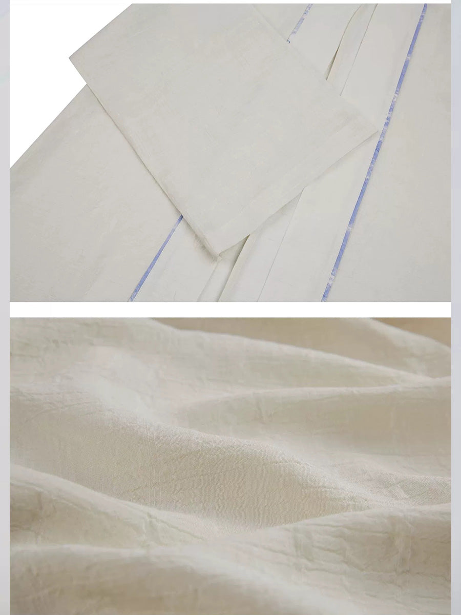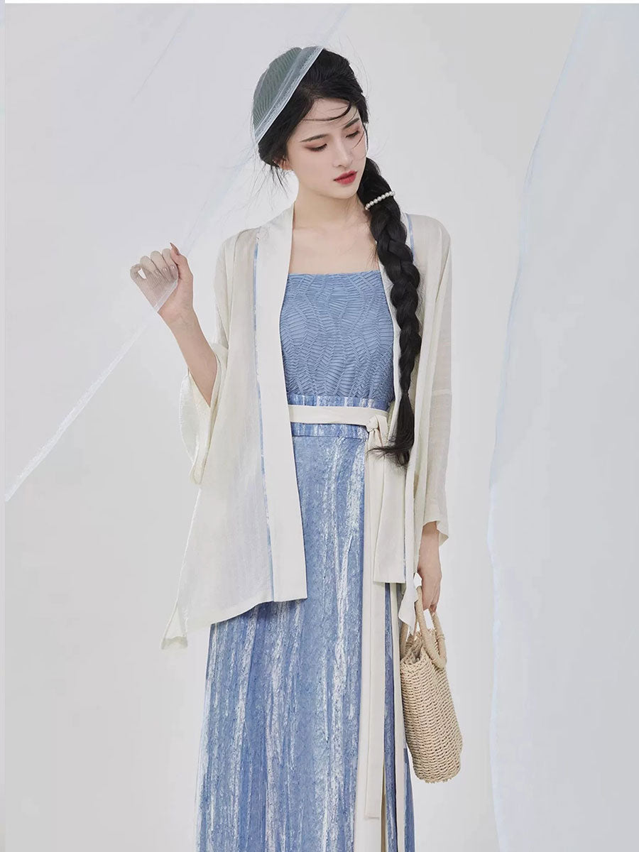 The Modified Song Camisole (改良宋抹 - gǎi liáng sòng mǒ) is crafted from a grey-blue, wavy-textured knit fabric that is soft, stretchy, skin-friendly, and treated to be anti-pilling. The Front-Opening Short Shirt (对襟短衫 - duì jīn duǎn shān) is made from a beige, striped fabric that is simple, versatile, light, and breathable, making it an excellent sun-protection layer for daily wear.