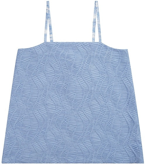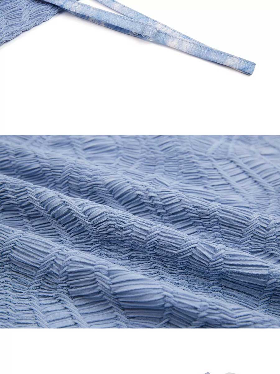The Three-Pleat Skirt (三裥裙 - sān jiǎn qún) features a beige fabric with an oil-painting-like texture, spliced with a solid blue panel. Its comfortable and flattering silhouette makes this entire ensemble a picturesque choice for any seaside adventure.