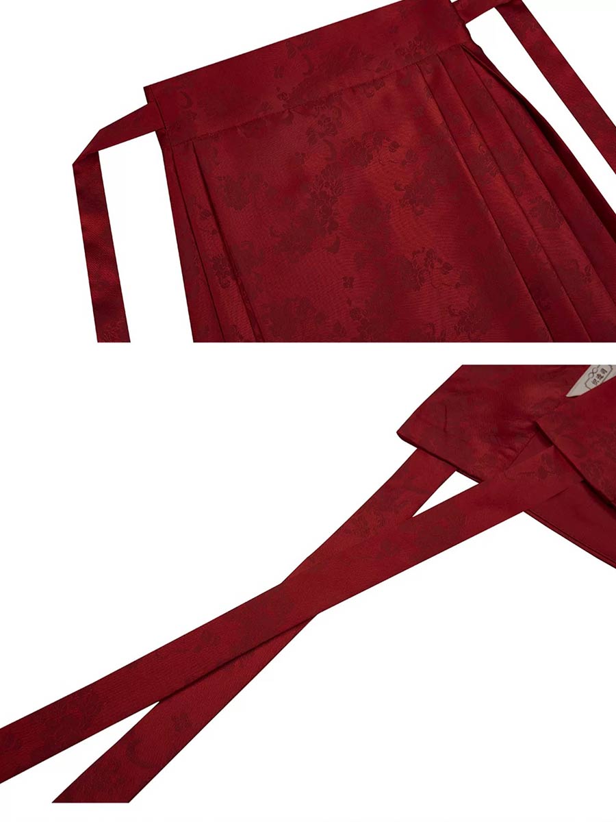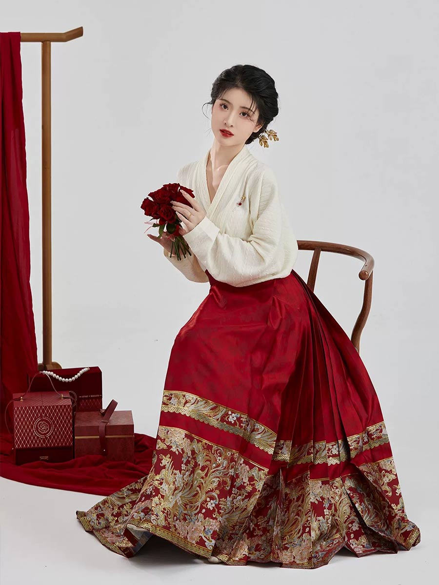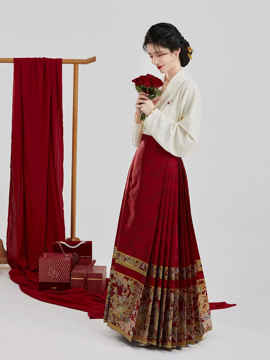 The Airplane Sleeve Top (飞机袖 - fēi jī xiù) is crafted from a simple and comfortable knit fabric, making it a highly versatile and cost-effective staple for everyday life. It comes with a complimentary rose brooch that can be worn on the chest or used as a separate accessory, adding a touch of elegance. This Hanfu set is perfect for joyous daily occasions, celebrations, and, of course, weddings.