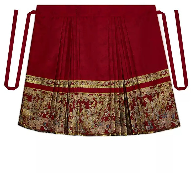 The "Di Jie" Mamian Skirt (缔结马面裙) is rich with symbolism. Its main motifs are the phoenix and peony, complemented by intricate patterns of sea pomegranate, daisy, and iris flowers. The寓意 is a life after marriage that is as splendid and radiant as a tapestry of blooming flowers. The phoenix, a mythical bird of good omen, symbolizes the harmonious union of the couple (鸾凤和鸣 - luán fèng hè míng).