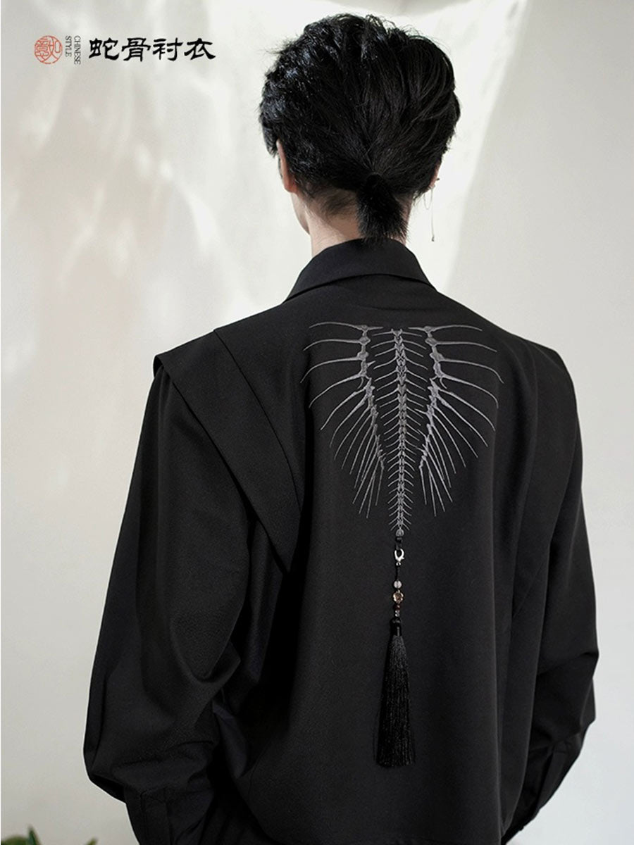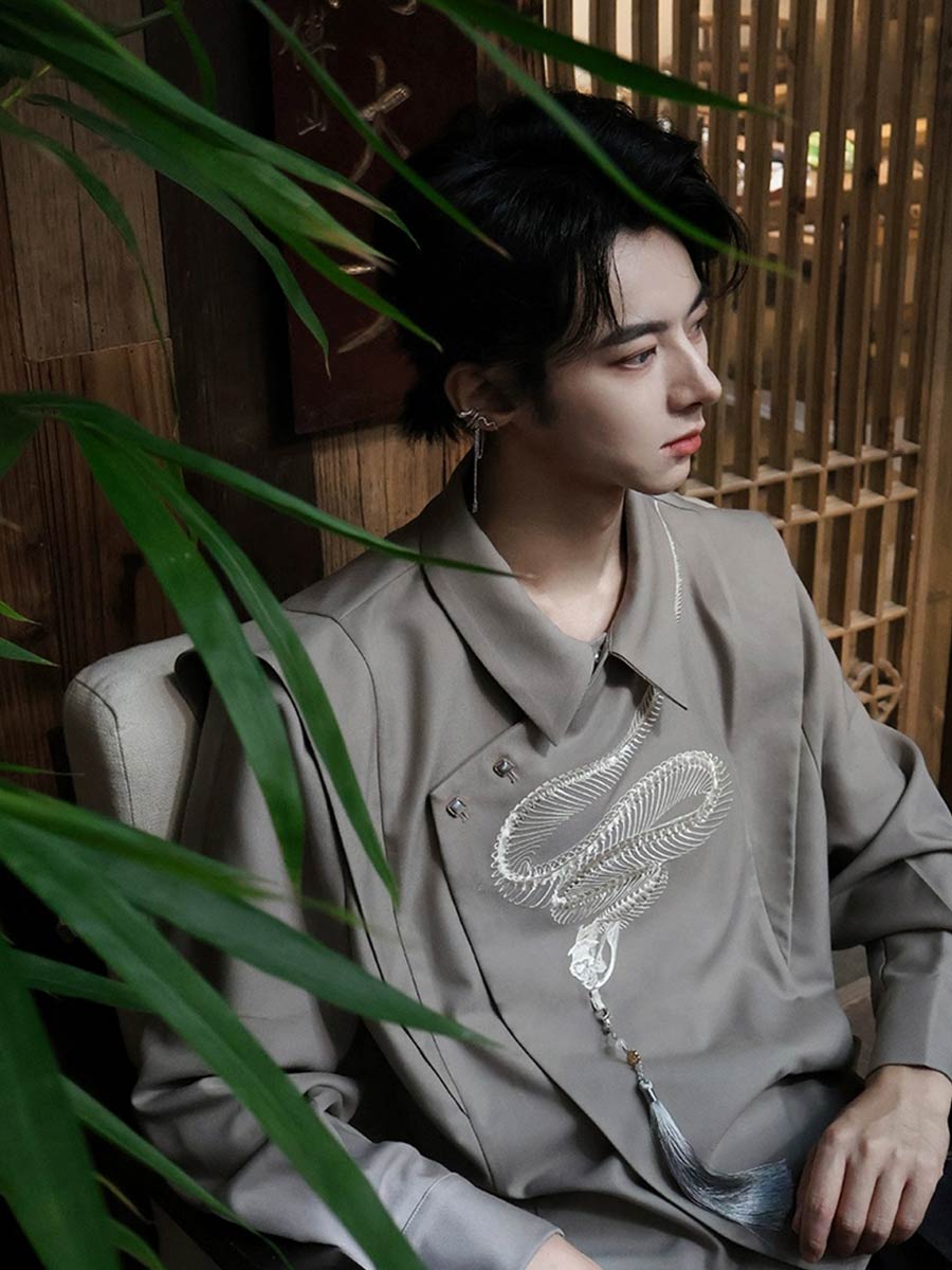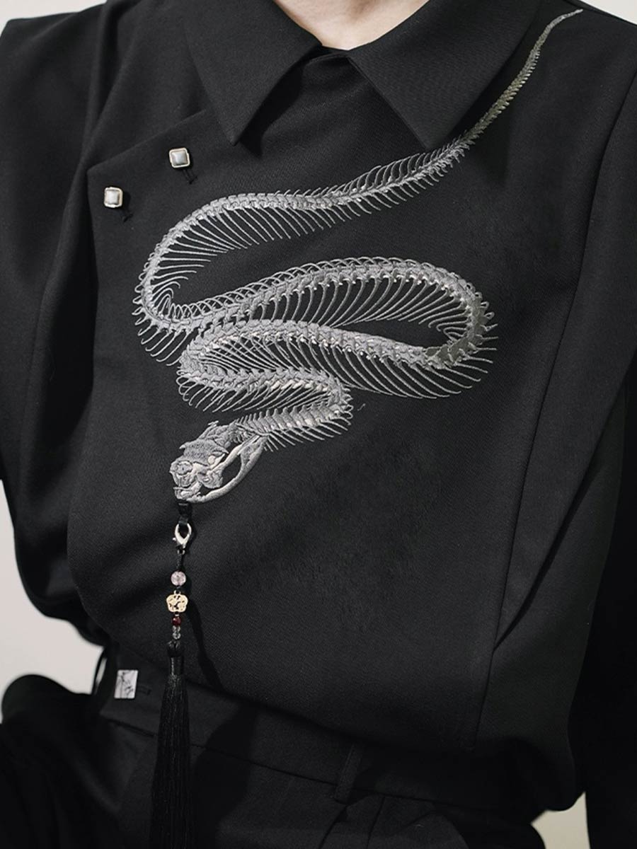 Make a striking statement with the 蛇骨 (Shé Gǔ - The Serpent's Spine) shirt, a standout piece from the [風华归国令] collection. This original design features a bold, heavy-industry embroidered serpent motif that wraps elegantly across the chest, perfect for achieving a sleek "New Chinese" neutral look. Crafted with a premium blend for a slight stretch and structured drape, this unisex shirt can be worn alone as a sharp top or unbuttoned as a light outer layer. Whether styled for a professional commute or a cultural outing, its modern silhouette and traditional craftsmanship offer a unique, gender-neutral aesthetic.