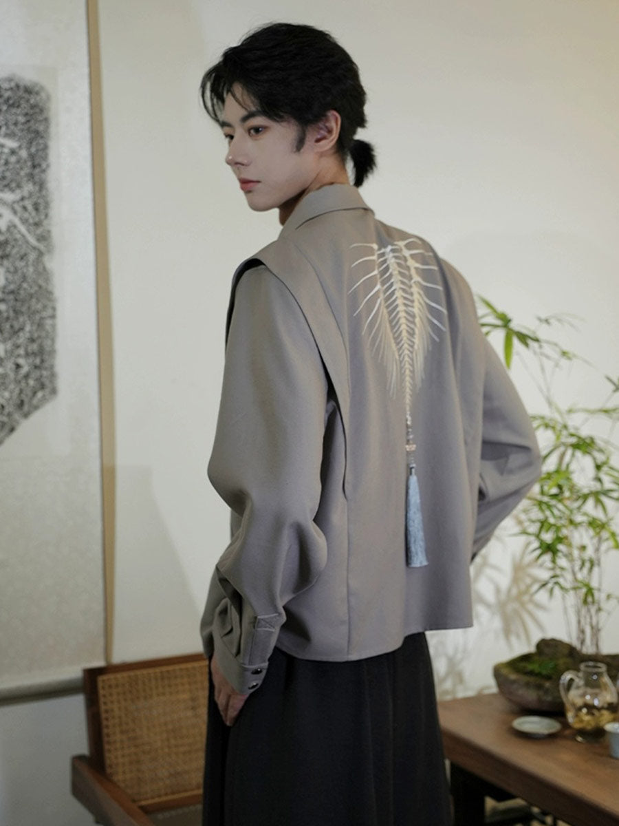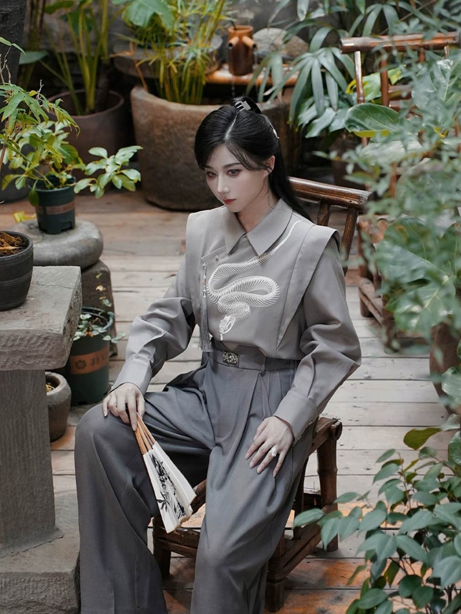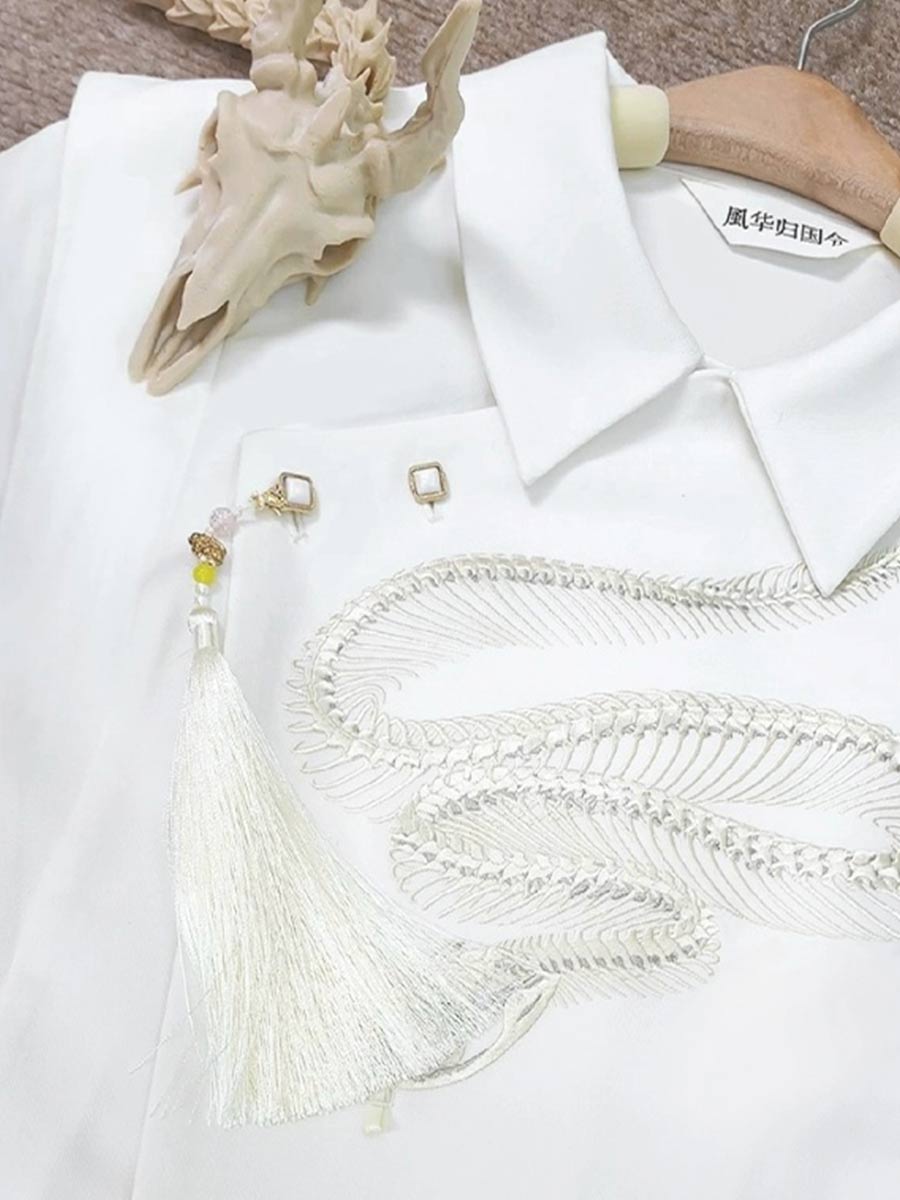 Make a striking statement with the 蛇骨 (Shé Gǔ - The Serpent's Spine) shirt, a standout piece from the [風华归国令] collection. This original design features a bold, heavy-industry embroidered serpent motif that wraps elegantly across the chest, perfect for achieving a sleek "New Chinese" neutral look. Crafted with a premium blend for a slight stretch and structured drape, this unisex shirt can be worn alone as a sharp top or unbuttoned as a light outer layer. Whether styled for a professional commute or a cultural outing, its modern silhouette and traditional craftsmanship offer a unique, gender-neutral aesthetic.