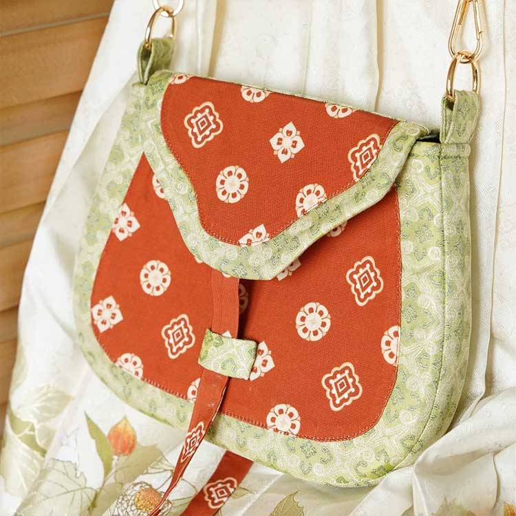 Drawing inspiration from the treasured relics of the Shosoin Repository, specifically the exquisite patterns of the ancient Pipa (Lute), the 橘绿团花 (Ju Lv Tuan Hua - Orange-Green Floral Roundel) bag captures the essence of Tang Dynasty aesthetics. This original "Huo Lang" (peddler style) bag features a classic flip-top design reimagined for modern commuters. Constructed with high-quality dark pattern jacquard and durable canvas, it offers both elegance and practicality. The bag is designed with a secure inner zipper and a convenient side pocket for organization. Finished with detachable, adjustable straps and light gold hardware, it is a versatile accessory for both traditional Hanfu styling and daily urban wear.
