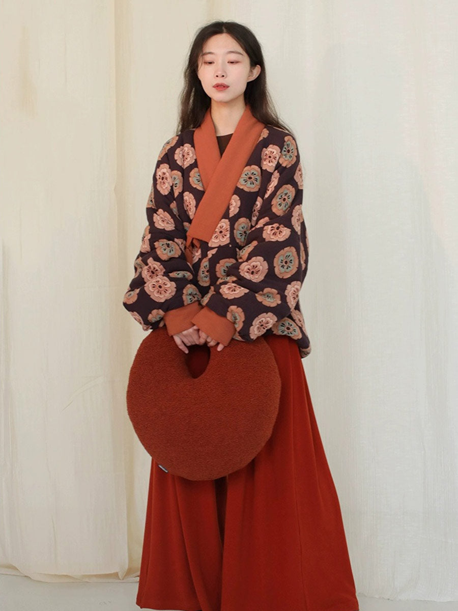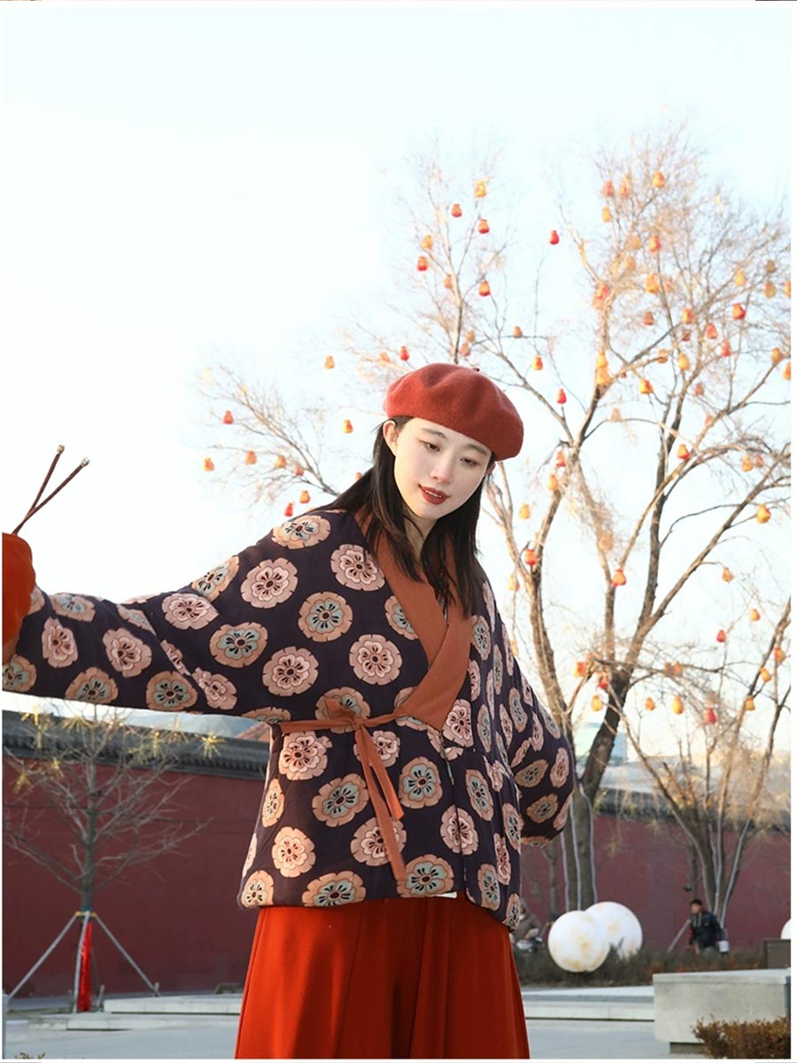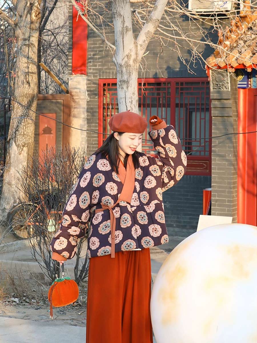 The core piece is the Tuanzi Short Padded Jacket (团子小棉袄 - tuán zi xiǎo mián ǎo), a short jacket (短袄) featuring a soft rayon fabric shell and filled with warm imitation silk cotton (纺丝棉). The jacket has a slight stretch and a loose silhouette, ensuring comfort and thermal retention. Its cheerful print, evoking 'tuanzi' or small round dumplings, adds a festive and cute touch.
