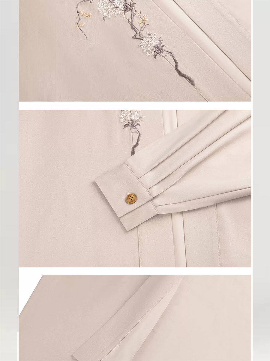 The Trench Coat Style Beizi (风衣褙子 - fēngyī bèi zǐ) is a modified outer robe with delicate embroidery on the chest, adding a touch of elegance that stands out in daily wear.