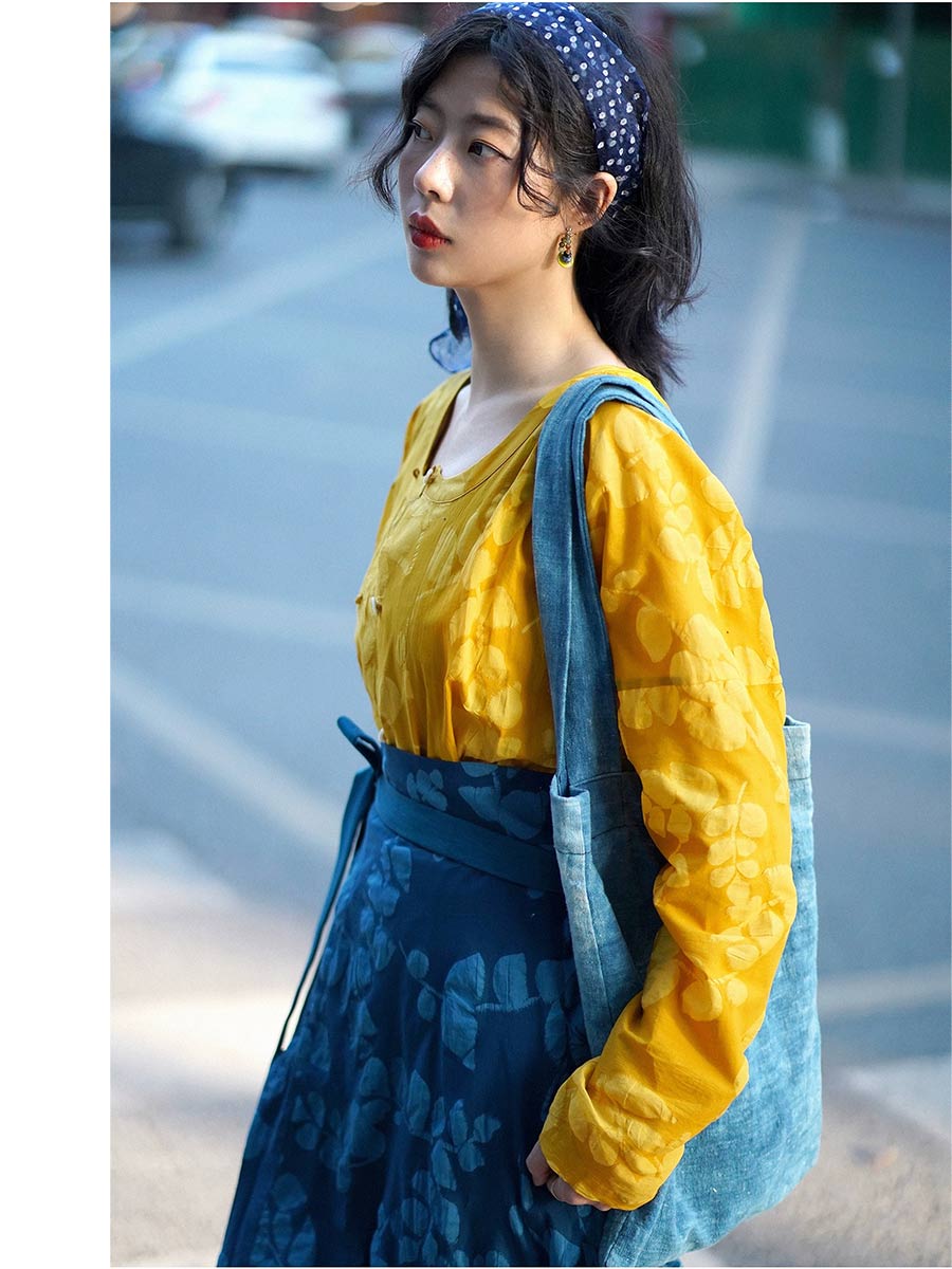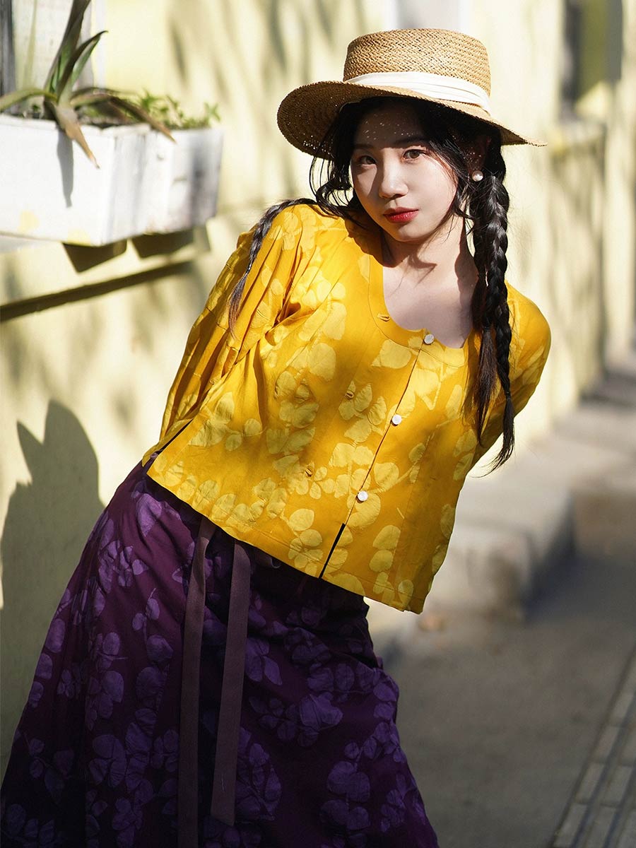 Introducing the "Zhi Zhi (枝枝 - Verdant Branches)" collection, designed with natural, branch-patterned fabrics for early summer. This series features two bright, contrasting color palettes perfect for dopamine dressing! The Yellow/Blue combination evokes youthful vitality, reminiscent of summer skies and oceans. The Yellow/Purple pairing is eye-catching and carries a mysterious summer vibe, like friends with wonderfully different personalities. Both colorways are highly inclusive, flattering, and easy to style.