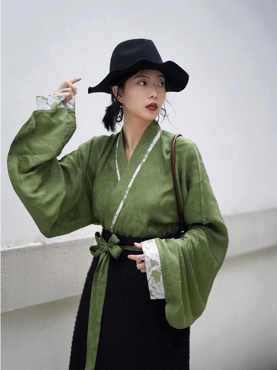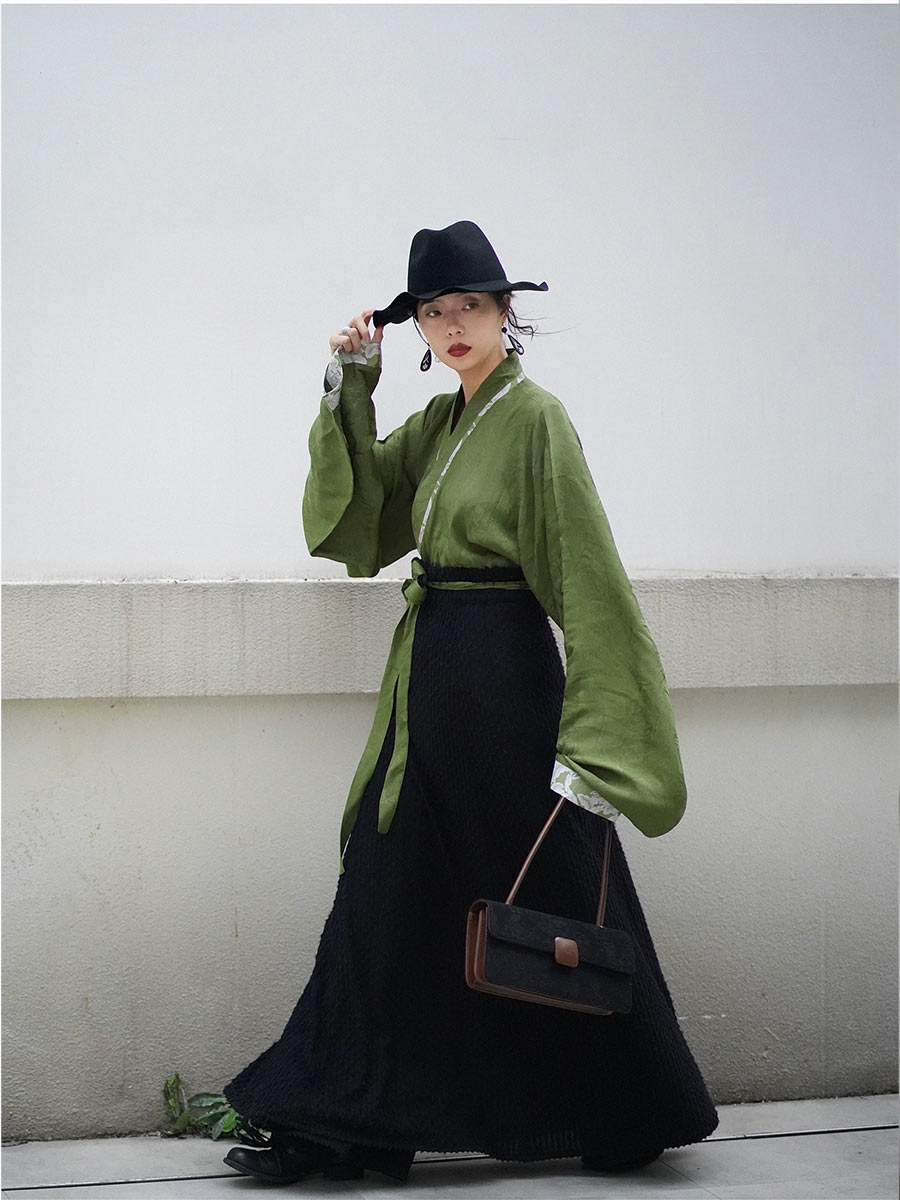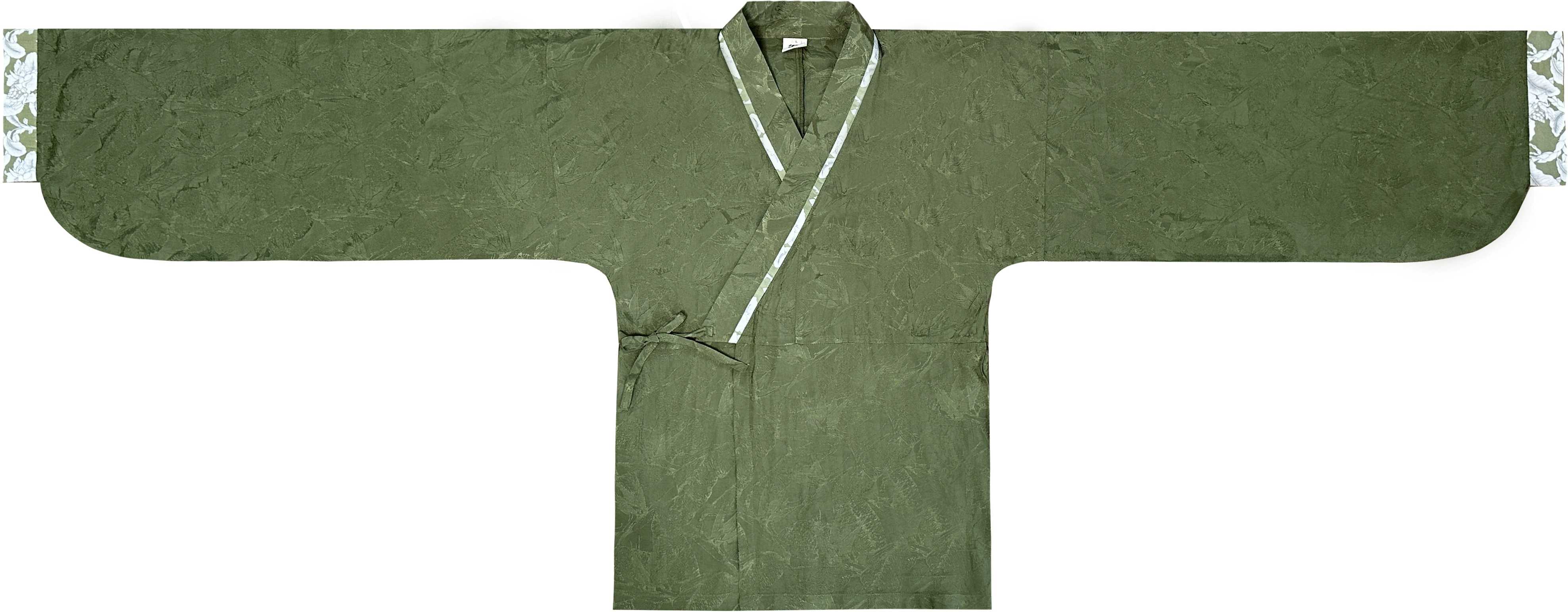 The Green Jin Robe (绿色晋襦 - lǜ sè jìn rú) offers an alternative style, primarily made from Tencel with added linen for excellent comfort and breathability. Its collar and cuffs feature lovely contrasting white jacquard trim with abstract floral and printed concrete patterns, unified within the same color family for a subtle yet layered look.