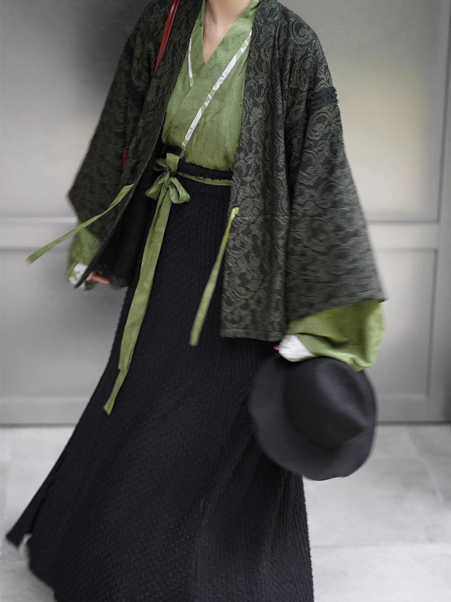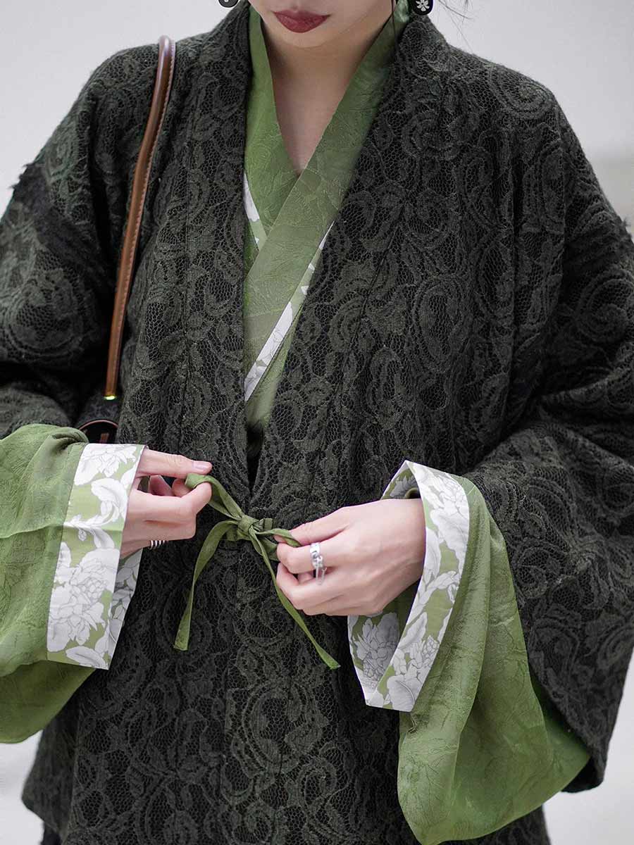 The Lace Jin Robe (蕾丝晋襦 - lěi sī jìn rú) is crafted from a double-layered composite fabric with an exquisite softness and drape. It's designed to fit well without appearing bulky, showcasing a low-key luxury with its green lace over a black base. A black patch on the shoulder adds a layer of visual interest.