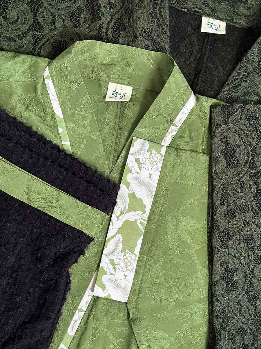 Presenting the "Lǜ Yè (绿夜 - Verdant Night)" collection, a Jin Dynasty style three-piece set marking our anniversary! This design makes groundbreaking use of a unique composite lace fabric. Although the original lace fabric from the first batch is no longer produced, we were determined to create this robe and have sourced a new lace for subsequent batches, aiming to replicate the original effect as closely as possible.