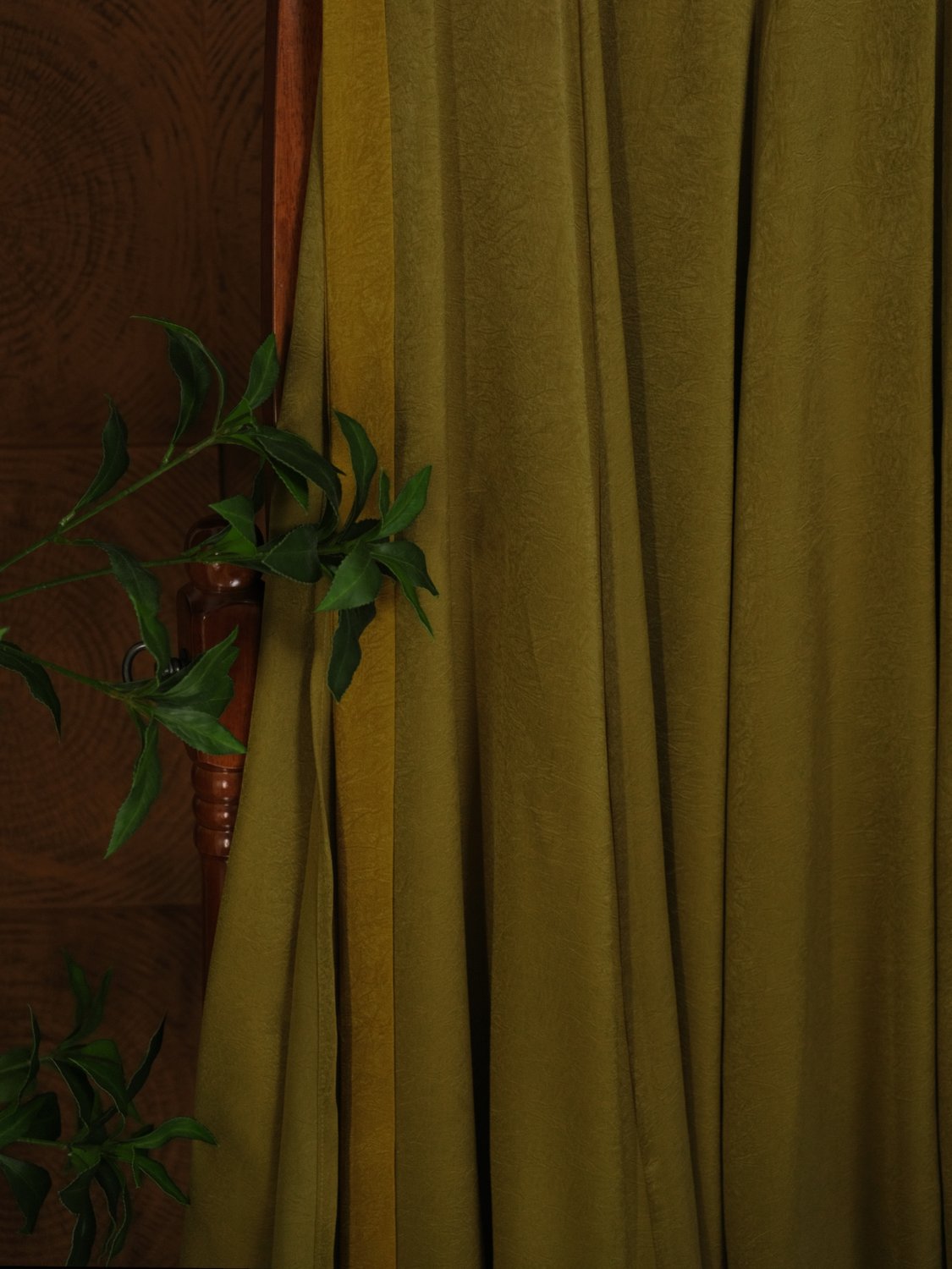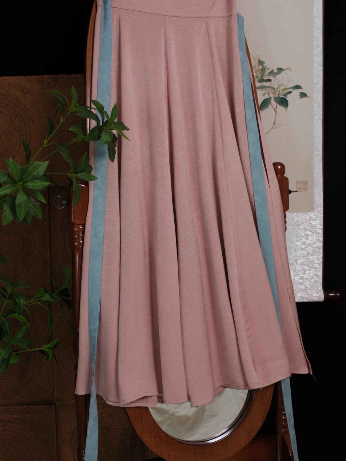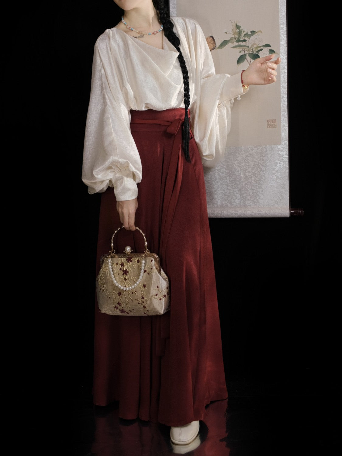 Explore the versatile elegance of the "Lu Ming Xi (鹿鸣溪 - Whispering Brook Deer)" collection with this Cowl Neck Shirt (荡领衫 - dàng lǐng shān) and Multi-Color Gore Skirt (多色破裙 - duō sè pò qún) pairing. This Tang-inspired set is perfect for creating sophisticated looks for daily commutes or special occasions.