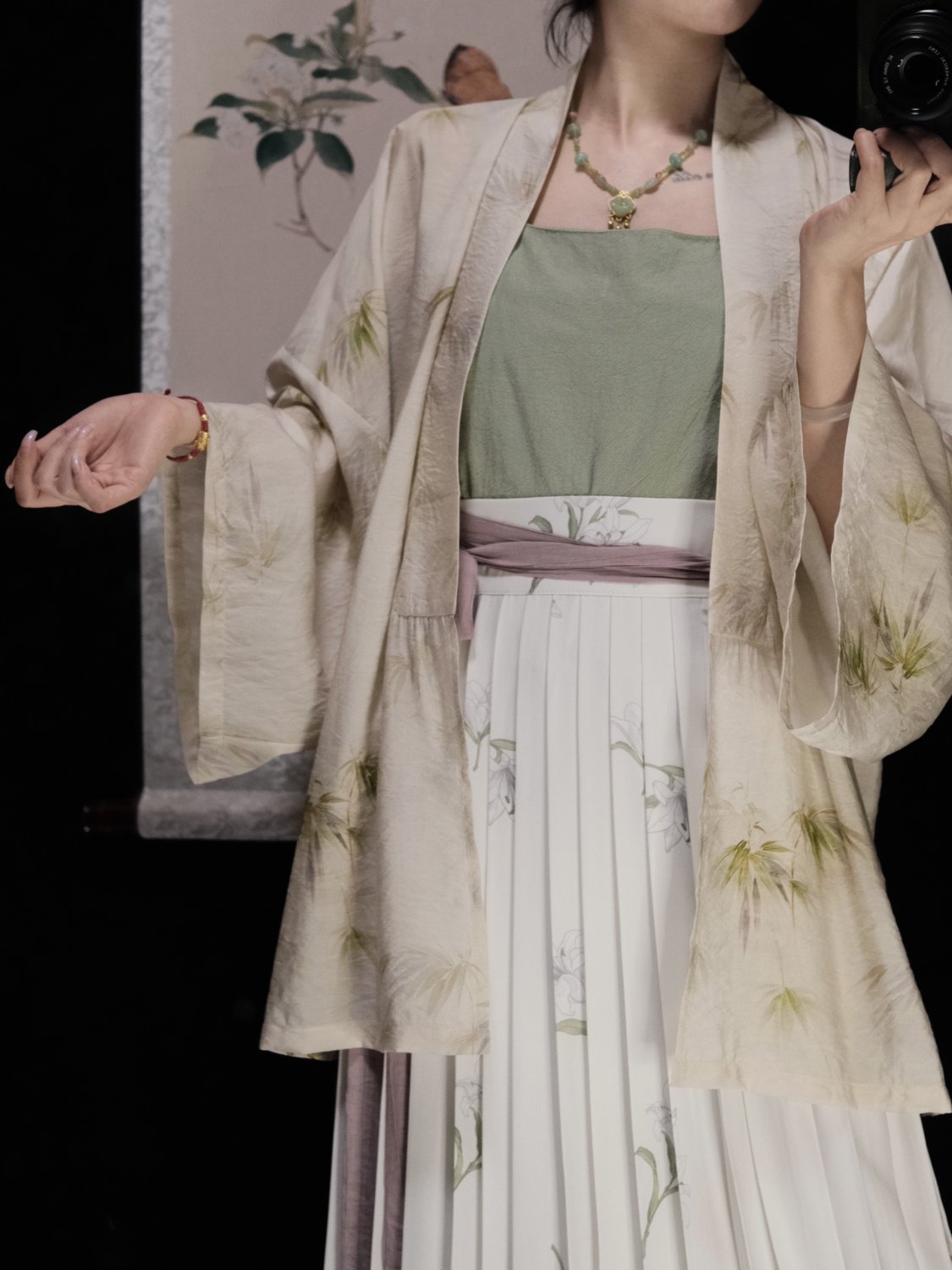 Discover the soft, breathable elegance of our Hanfu-inspired Printed Rayon He-Collar Shirt (印花人棉合领衫 - yìnhuā rénmián hé lǐng shān). This versatile piece, featuring classic airplane sleeves, functions beautifully as a light cardigan or outer layer for various occasions.
